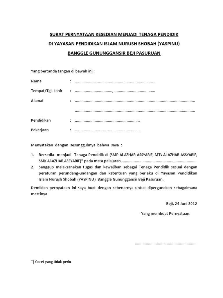 Doc Surat Pernyataan Kesanggupan Bekerja Tahun Pelajaran 2010 2011 Yayasan Bina Sejahtera Kwa Hui Academia Edu